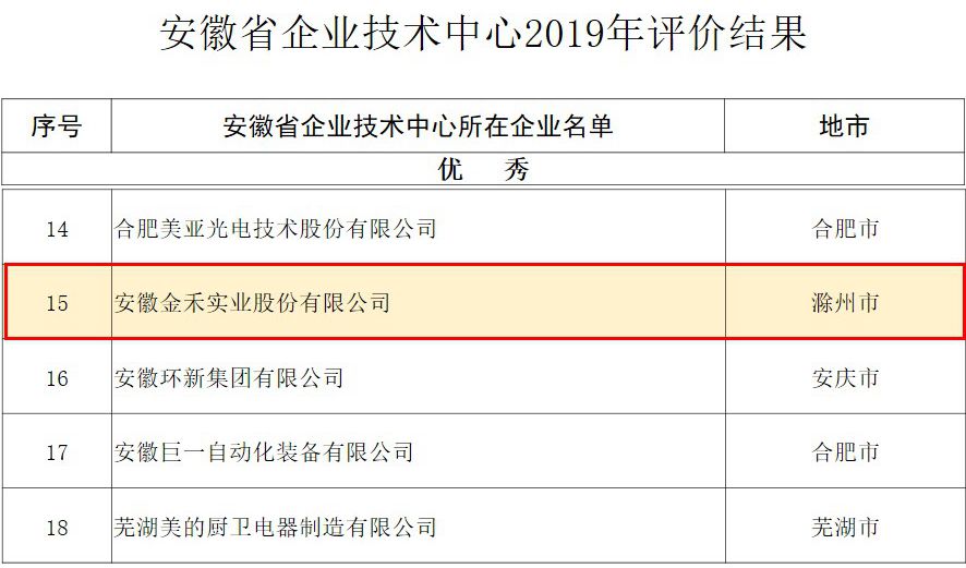 為推進(jìn)以企業(yè)為主體的技術(shù)創(chuàng)新體系建設(shè),增強(qiáng)企業(yè)創(chuàng)新能力,根據(jù)《安徽省企業(yè)技術(shù)中心認(rèn)定管理辦法》(皖經(jīng)信科技〔2018〕46號(hào))評(píng)價(jià)結(jié)果通知,安徽金禾實(shí)業(yè)通過(guò)省企業(yè)技術(shù)中心評(píng)價(jià),并獲得優(yōu)秀,位列第15位,評(píng)價(jià)分?jǐn)?shù)逐年獲得新高,體現(xiàn)了企業(yè)科技創(chuàng)新能力不斷提升。