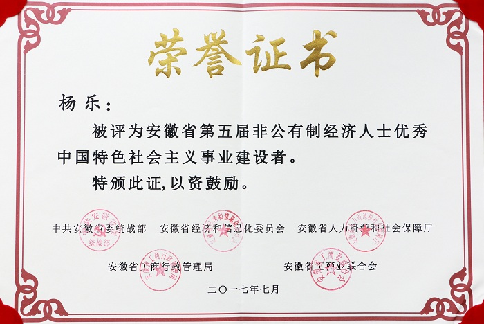 楊樂(lè)副董事長(zhǎng)被表彰為“安徽省第五屆非公有制經(jīng)濟(jì)人士?jī)?yōu)秀中國(guó)特色社會(huì)主義事業(yè)建設(shè)者”